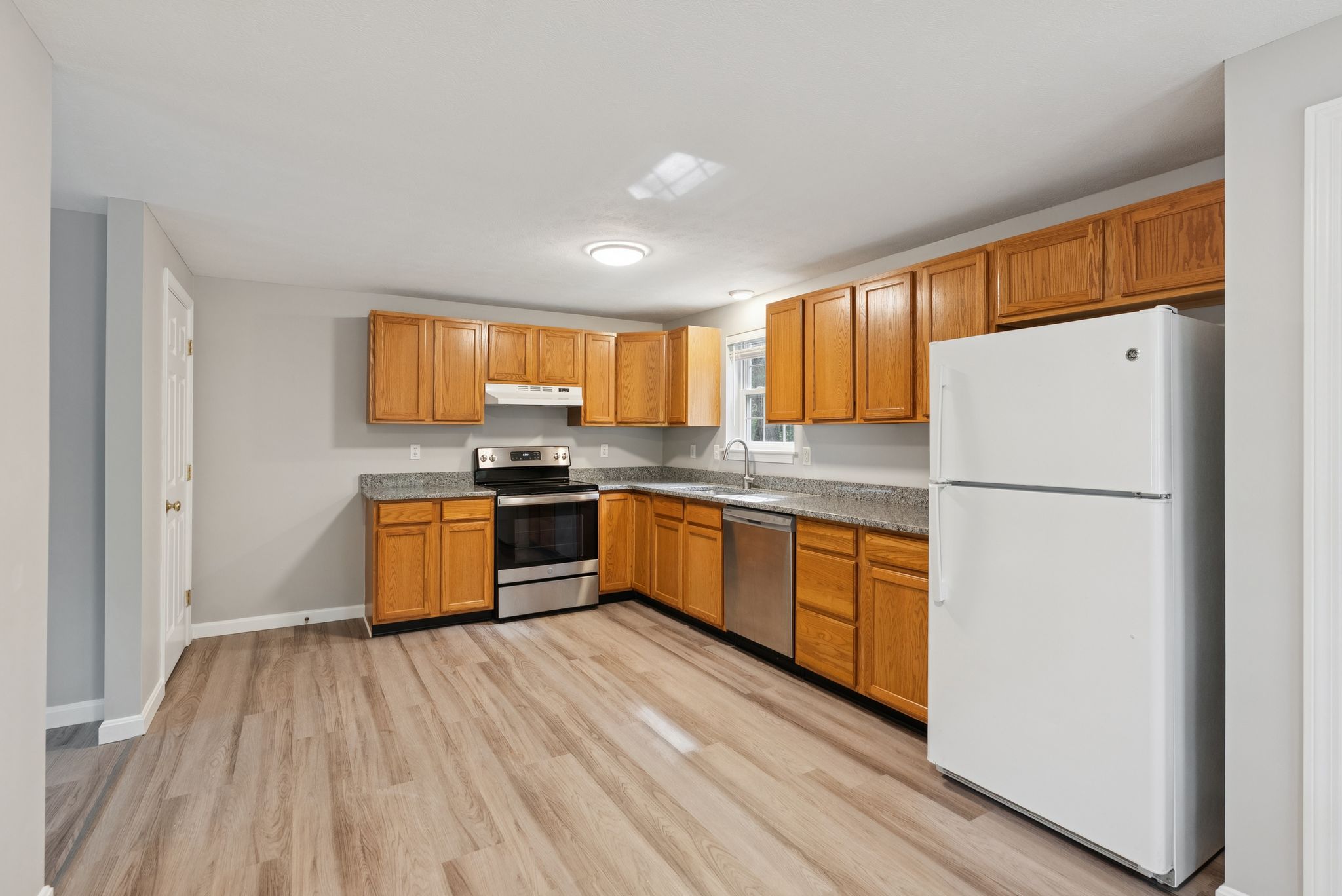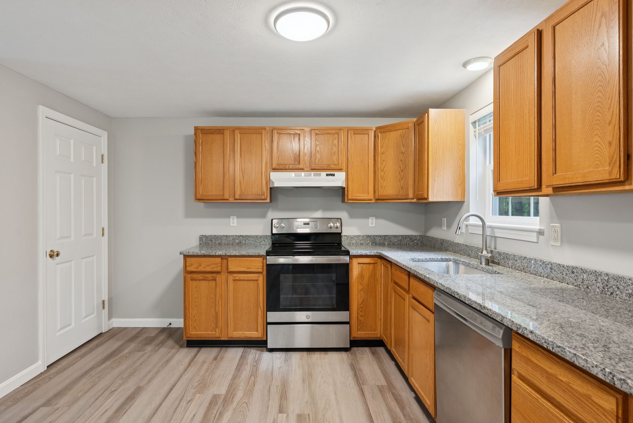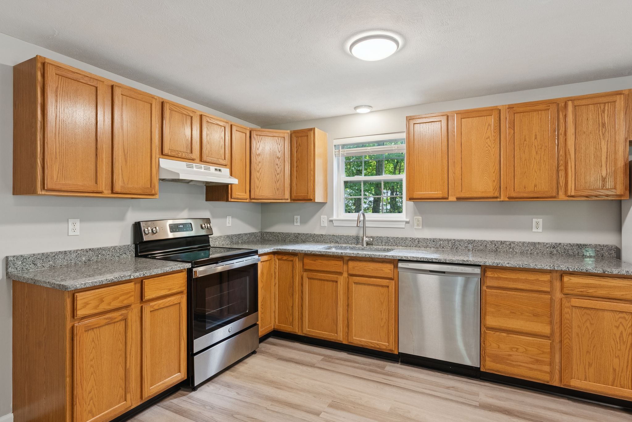 • Eat-in kitchen with electric range, refrigerator, and dishwasher